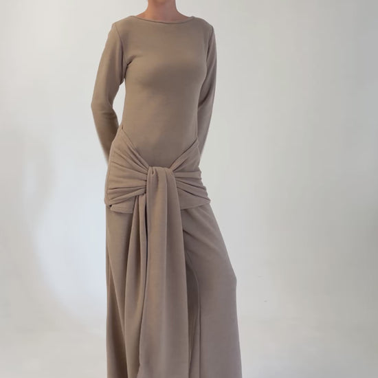 A refined knit top in soft beige, defined by its signature front knot that enhances the waist and adds sculptural detail to the silhouette. With its gentle drape and long sleeves, it offers both comfort and understated sophistication. Pair it effortlessly with the Beige Flared Knit Trousers for an elegant monochrome look.