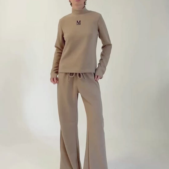 Crafted from a fine knit in a soft beige tone, this top features a structured high neckline and the collection’s signature embroidered logo. Its refined simplicity and fluid texture create a timeless, modern silhouette. Complete the look with the Beige Flared Knit Trousers for an elegant monochrome statement.