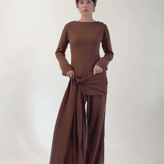 This brown knit top features a distinctive front knot that creates a flattering, modern shape. Crafted from a soft, fluid knit with long sleeves, it combines comfort with contemporary style. Complete the look with the Brown Flared Knit Trousers for a sleek, balanced outfit.